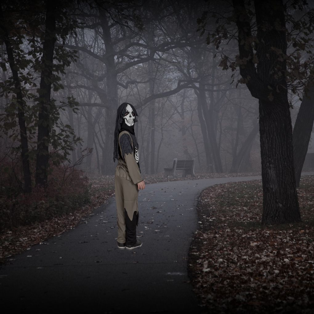 This special-edition costume features a detailed skull design that captures the essence of the spooky season without being too scary for kids. It features comfortable, breathable fabric that allows your child to wear it all night while staying active. The costume set is easy to put on and take off, making it practical for little trick-or-treating.